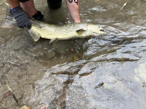 Tiny bowfin on the nightcrawler, 6lb fluoro. Panfishing slowed down with the salmon running back and forth, 4ft from the bank. I also watched a seagull make 10 passes on a dead pumpkinseed before picking it up lol