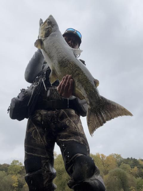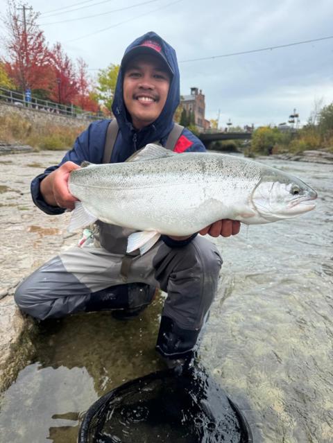 Landed six and lost some. They’re so strong and after a while my lower back tells me that I’m done for the day. The big one was just over 32 Lbs on a steelhead magnet as usual. The rain helped 😎
