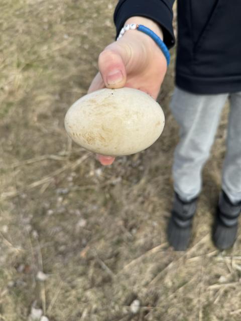 I was just fishing with my dad and we saw this in the water, we looked it up and apparently it was a goose egg. We quickly put it by a tree, so the parents could find it.