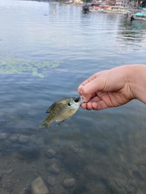Hooked a bass but he became unhooked right before we got him in the boat. Lots of perch following my crank bait, finally landed this little bluegill on the way back to the boat ramp.