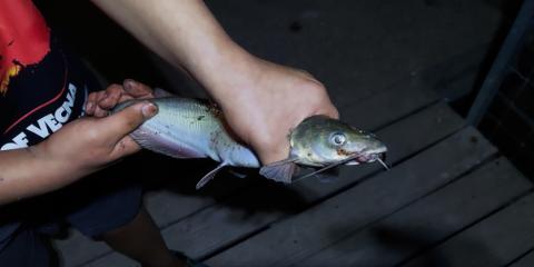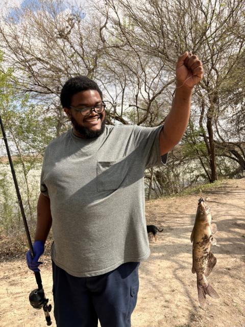 My fiancé caught his first catfish today! He used garlic-scented night crawlers (in a purple container).
