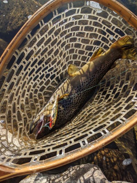 caught the rainbow in the pond next to the river and the hog brownie in the river. caught 9 fish all on a 4" suspending holographic brown trout rebel tracdown. what a fun morning