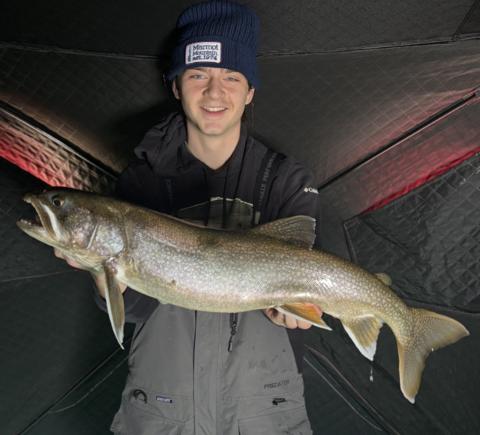 Today I finally got onto my first hard water fish of 2026! I managed to pull up this little laker in 95 feet of water, the deepest I’ve ever fished. This guy ate my baby whale swimbait on a megabass spinhead jig. Hopefully I can get onto some bigger ones in a few days!