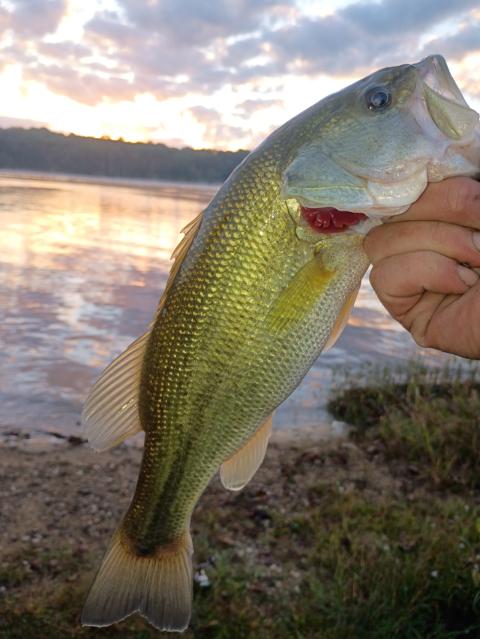 Fished all night at woods Res and caught only one night bass. Met some cool people tho!!!! Jasmin if you read this holla at me!!!! Then the sun came up and the bass was lazy so I went back to Tim's Ford and second cast caught this one. Then had one break my lure in half so it's nap time lmao happy fishing y'all!!!!!