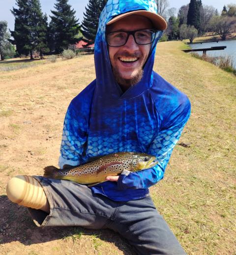 Another early morning fly fishing session with fly guide David from Millstream farm 🇿🇦 waters were boiling with rises as we observed a hatch of super fast yet tiny beetle-like insects surfacing before disappearing again. The bow chases and extravagant jumps prompted David to suggest that I change my thin x5 tippet to a stronger stiffer x2 tippet. I thank my lucky stars for having David's invaluable knowledge, for just as I casted out the x2 tippet with foam hopper, I got smashed by the meanest rainbow in the feeding frenzy. Within seconds it ran my retrieved slack fly line all the way down, the reel whining sharply as he refused lead on. After a 2 min fight he slacks down for just a few seconds for me to start retrieving before smashing ahead in a new attempt to get free. David excitedly guides me to secure this energetic beast. After 4 mins I finally won the battle in securing this 51cm, 1,7kg raging rainbow trout! Once again thanks for your special guidance David 🇿🇦 it was an absolute pleasure to learn from you and to study and develop new methods of fly fishing on the farm (from 5am) with you!